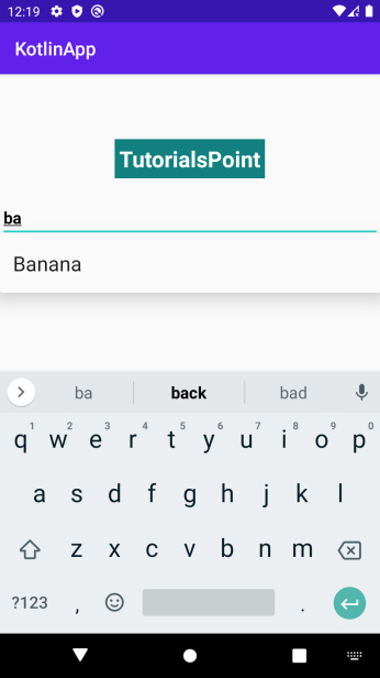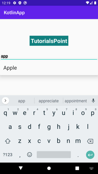 <?xml version="1.0" encoding="utf-8"?> <RelativeLayout xmlns:android="http://schemas.android.com/apk/res/android" xmlns:tools="http://schemas.android.com/tools" android:id="@+id/relativeLayout" android:layout_width="match_parent" android:layout_height="match_parent" tools:context=".MainActivity"> <TextView android:id="@+id/text2" android:layout_width="wrap_content" android:layout_height="wrap_content" android:layout_centerHorizontal="true" android:layout_marginTop="70dp" android:background="#008080" android:padding="5dp" android:text="TutorialsPoint" android:textColor="#fff" android:textSize="24sp" android:textStyle="bold" /> <AutoCompleteTextView android:id="@+id/text" android:layout_width="match_parent" android:layout_height="wrap_content" android:layout_below="@+id/text2" android:layout_marginTop="20dp" android:hint="Enter fruit name" android:textColor="@android:color/background_dark" android:textStyle="bold" /> </RelativeLayout>