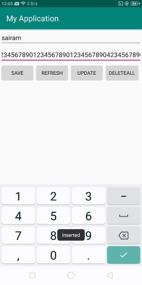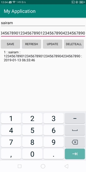 <?xml version = "1.0" encoding = "utf-8"?> <LinearLayout xmlns:android = "http://schemas.android.com/apk/res/android" xmlns:tools = "http://schemas.android.com/tools" android:layout_width = "match_parent" android:layout_height = "match_parent" tools:context = ".MainActivity" android:orientation = "vertical"> <EditText android:id = "@+id/name" android:layout_width = "match_parent" android:hint = "Enter Name" android:layout_height = "wrap_content" /> <EditText android:id = "@+id/salary" android:layout_width = "match_parent" android:inputType = "numberDecimal" android:hint = "Enter Salary" android:layout_height = "wrap_content" /> <LinearLayout android:layout_width = "wrap_content" android:layout_height = "wrap_content"> <Button android:id = "@+id/save" android:text = "Save" android:layout_width = "wrap_content" android:layout_height = "wrap_content" /> <Button android:id = "@+id/refresh" android:text = "Refresh" android:layout_width = "wrap_content" android:layout_height = "wrap_content" /> <Button android:id = "@+id/udate" android:text = "Update" android:layout_width = "wrap_content" android:layout_height = "wrap_content" /> <Button android:id = "@+id/Delete" android:text = "DeleteALL" android:layout_width = "wrap_content" android:layout_height = "wrap_content" /> </LinearLayout> <ListView android:id = "@+id/listView" android:layout_width = "match_parent" android:layout_height = "wrap_content"> </ListView> </LinearLayout>