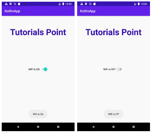 <?xml version="1.0" encoding="utf-8"?> <RelativeLayout xmlns:android="http://schemas.android.com/apk/res/android" xmlns:tools="http://schemas.android.com/tools" android:layout_width="match_parent" android:layout_height="match_parent" tools:context=".MainActivity"> <TextView android:id="@+id/textView" android:layout_width="wrap_content" android:layout_height="wrap_content" android:layout_centerHorizontal="true" android:layout_marginTop="50dp" android:padding="8dp" android:text="Tutorials Point" android:textColor="@color/colorPrimaryDark" android:textSize="48sp" android:textStyle="bold" /> <Switch android:id="@+id/wifiSwitch" android:layout_width="wrap_content" android:layout_height="wrap_content" android:layout_centerInParent="true" /> </RelativeLayout>