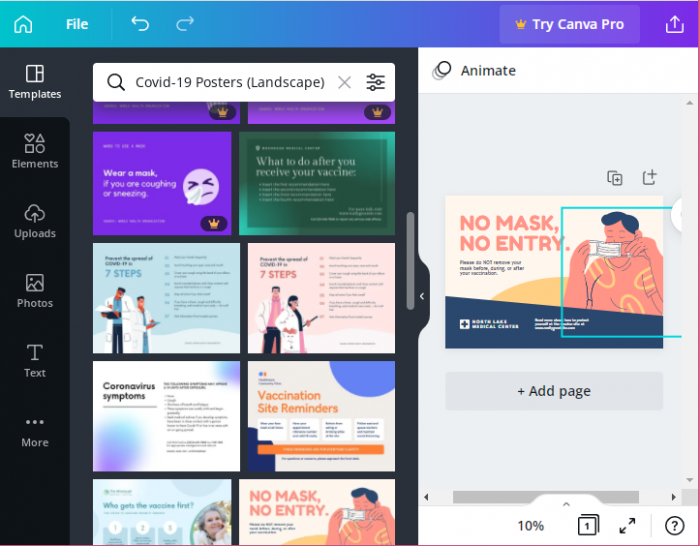 由於我們希望為Covid-19建立海報,因此我們將在給定的搜尋欄中專門搜尋它。我們將瀏覽各種模板並選擇最適合我們的那個。點選模板後,它將準備就緒並可以進行編輯。