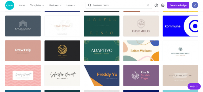 比如說,我們選擇設計一張名片。當您選擇該選項時,您將被重定向到一個新頁面,您將在其中獲得各種可供選擇的模板。