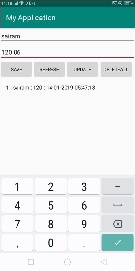 <?xml version="1.0" encoding="utf-8"?> <LinearLayout xmlns:android="http://schemas.android.com/apk/res/android" xmlns:tools="http://schemas.android.com/tools" android:layout_width="match_parent" android:layout_height="match_parent" tools:context=".MainActivity" android:orientation="vertical"> <EditText android:id="@+id/name" android:layout_width="match_parent" android:hint="Enter Name" android:layout_height="wrap_content" /> <EditText android:id="@+id/salary" android:layout_width="match_parent" android:inputType="numberDecimal" android:hint="Enter Salary" android:layout_height="wrap_content" /> <LinearLayout android:layout_width="wrap_content" android:layout_height="wrap_content"><Button android:id="@+id/save" android:text="Save" android:layout_width="wrap_content" android:layout_height="wrap_content" /> <Button android:id="@+id/refresh" android:text="Refresh" android:layout_width="wrap_content" android:layout_height="wrap_content" /> <Button android:id="@+id/udate" android:text="Update" android:layout_width="wrap_content" android:layout_height="wrap_content" /> <Button android:id="@+id/Delete" android:text="DeleteALL" android:layout_width="wrap_content" android:layout_height="wrap_content" /> </LinearLayout> <ListView android:id="@+id/listView" android:layout_width="match_parent" android:layout_height="wrap_content"> </ListView> </LinearLayout>