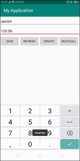 在上面的程式碼中,我們使用了姓名和工資作為編輯文字,當用戶點選儲存按鈕時,它會將資料儲存到sqlite資料庫中。點選重新整理按鈕獲取列表檢視。