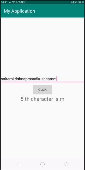 package com.example.myapplication; import android.os.Bundle; import android.support.v7.app.AppCompatActivity; import android.view.View; import android.widget.Button; import android.widget.EditText; import android.widget.TextView; public class MainActivity extends AppCompatActivity { EditText name; Button button; TextView text; @Override protected void onCreate(Bundle savedInstanceState) { super.onCreate(savedInstanceState); setContentView(R.layout.activity_main); name = findViewById(R.id.name); button = findViewById(R.id.click); text = findViewById(R.id.textview); button.setOnClickListener(new View.OnClickListener() { @Override public void onClick(View v) { if (!name.getText().toString().isEmpty()) { if (name.getText().toString().length() >= 5) { char ch = name.getText().toString().charAt(5); text.setText("5 th character is " + String.valueOf(ch)); } } else { name.setError("Plz enter name"); } } }); } }