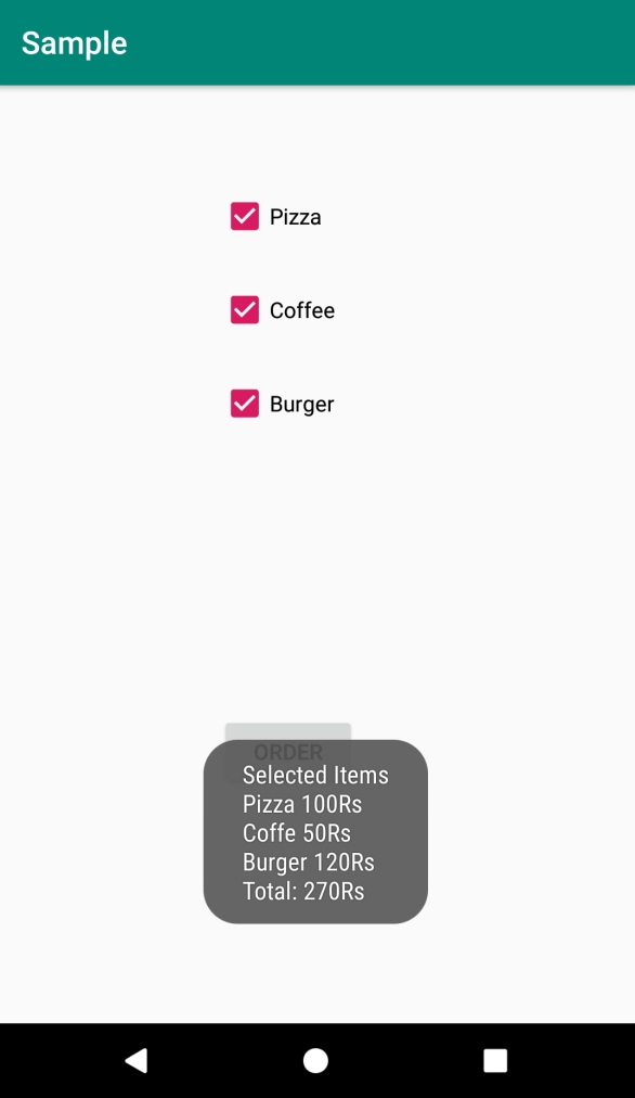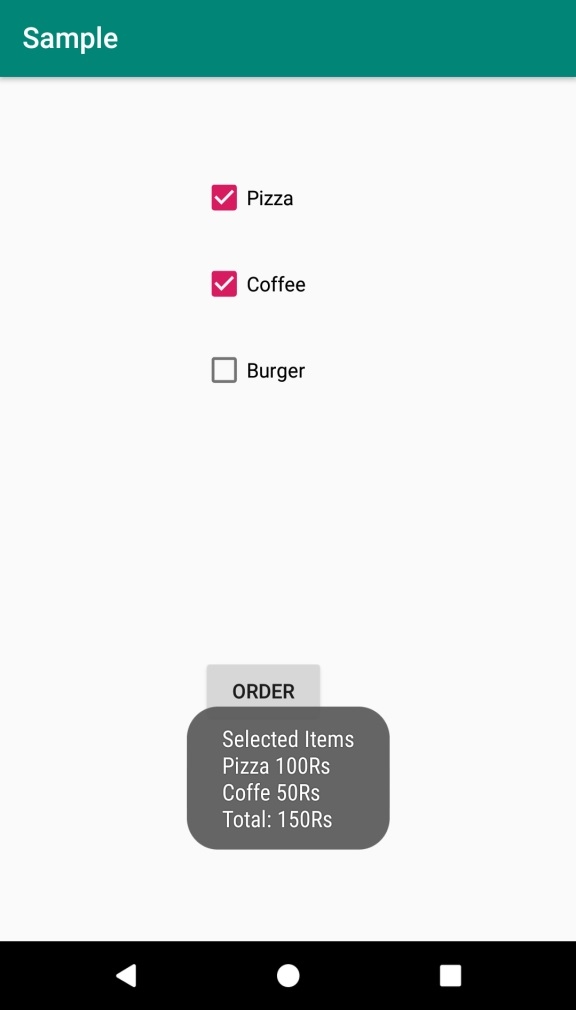 <?xml version="1.0" encoding="utf-8"?> <android.support.constraint.ConstraintLayout xmlns:android="http://schemas.android.com/apk/res/android" xmlns:app="http://schemas.android.com/apk/res-auto" xmlns:tools="http://schemas.android.com/tools" android:layout_width="match_parent" android:layout_height="match_parent" tools:context="MainActivity"> <CheckBox android:id="@+id/checkBox" android:layout_width="wrap_content" android:layout_height="wrap_content" android:layout_marginLeft="144dp" android:layout_marginTop="68dp" android:text="Pizza" app:layout_constraintStart_toStartOf="parent" app:layout_constraintTop_toTopOf="parent" /> <CheckBox android:id="@+id/checkBox2" android:layout_width="wrap_content" android:layout_height="wrap_content" android:layout_marginLeft="144dp" android:layout_marginTop="28dp" android:text="Coffee" app:layout_constraintStart_toStartOf="parent" app:layout_constraintTop_toBottomOf="@+id/checkBox" /> <CheckBox android:id="@+id/checkBox3" android:layout_width="wrap_content" android:layout_height="wrap_content" android:layout_marginLeft="144dp" android:layout_marginTop="28dp" android:text="Burger" app:layout_constraintStart_toStartOf="parent" app:layout_constraintTop_toBottomOf="@+id/checkBox2" /> <Button android:id="@+id/button" android:layout_width="wrap_content" android:layout_height="wrap_content" android:layout_marginLeft="144dp" android:layout_marginTop="184dp" android:text="Order" app:layout_constraintStart_toStartOf="parent" app:layout_constraintTop_toBottomOf="@+id/checkBox3" /> </android.support.constraint.ConstraintLayout>