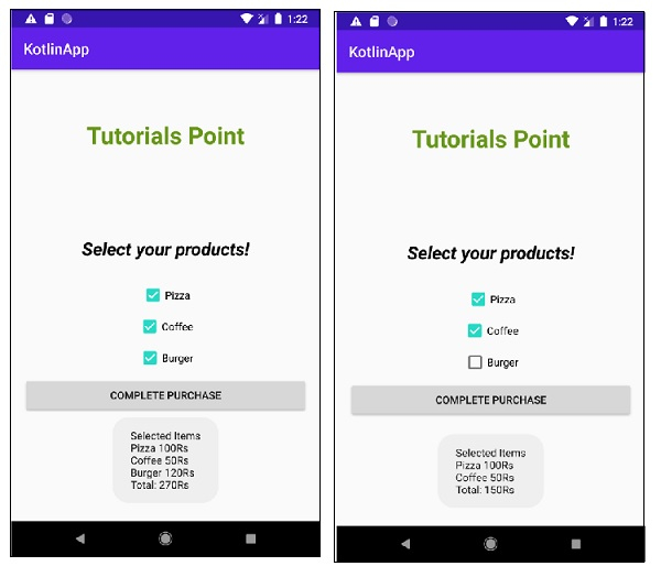 <?xml version="1.0" encoding="utf-8"?> <RelativeLayout xmlns:android="http://schemas.android.com/apk/res/android" xmlns:app="http://schemas.android.com/apk/res-auto" xmlns:tools="http://schemas.android.com/tools" android:layout_width="match_parent" android:layout_height="match_parent" android:padding="16dp" tools:context="MainActivity"> <TextView android:layout_width="wrap_content" android:layout_height="wrap_content" android:layout_centerHorizontal="true" android:layout_marginTop="50dp" android:text="Tutorials Point" android:textAlignment="center" android:textColor="@android:color/holo_green_dark" android:textSize="32sp" android:textStyle="bold" /> <TextView android:layout_width="match_parent" android:layout_height="wrap_content" android:layout_above="@id/checkBox1" android:layout_marginBottom="30dp" android:text="Select your products!" android:textAlignment="center" android:textColor="@android:color/background_dark" android:textSize="24sp" android:textStyle="bold|italic" /> <CheckBox android:id="@+id/checkBox1" android:layout_width="wrap_content" android:layout_height="wrap_content" android:layout_centerInParent="true" android:text="Pizza" /> <CheckBox android:id="@+id/checkBox2" android:layout_width="wrap_content" android:layout_height="wrap_content" android:layout_below="@id/checkBox1" android:layout_centerInParent="true" android:layout_marginTop="10dp" android:text="Coffee" /> <CheckBox android:id="@+id/checkBox3" android:layout_width="wrap_content" android:layout_height="wrap_content" android:layout_below="@id/checkBox2" android:layout_centerInParent="true" android:layout_marginTop="10dp" android:text="Burger" /> <Button android:id="@+id/button" android:layout_width="match_parent" android:layout_height="wrap_content" android:layout_below="@id/checkBox3" android:layout_marginTop="10dp" android:text="Complete purchase" /> </RelativeLayout>
