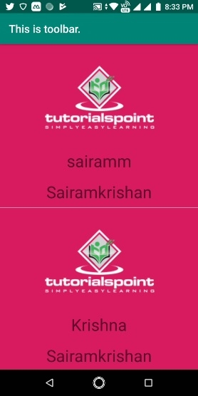 <?xml version = "1.0" encoding = "utf-8"?> <android.support.constraint.ConstraintLayout xmlns:android = "http://schemas.android.com/apk/res/android" xmlns:app = "http://schemas.android.com/apk/res-auto" xmlns:tools = "http://schemas.android.com/tools" android:layout_width = "match_parent" android:layout_height = "wrap_content" android:background = "@color/colorAccent" tools:context = ".MainActivity"> <ImageView android:id = "@+id/imageView2" android:layout_width = "wrap_content" android:layout_height = "wrap_content" android:src = "@drawable/logo" app:layout_constraintBottom_toBottomOf = "parent" app:layout_constraintEnd_toEndOf = "parent" app:layout_constraintStart_toStartOf = "parent" app:layout_constraintTop_toTopOf = "parent" app:layout_constraintVertical_bias = "0.209" /> <TextView android:id = "@+id/title" android:layout_width = "match_parent" android:layout_height = "wrap_content" android:layout_marginTop = "35dp" android:gravity = "center" android:textSize = "30sp" app:layout_constraintTop_toBottomOf = "@+id/imageView2" tools:layout_editor_absoluteX = "0dp" /> <TextView android:id = "@+id/textview2" android:layout_width = "match_parent" android:layout_height = "wrap_content" android:layout_marginTop = "16dp" android:layout_marginBottom = "8dp" android:gravity = "center" android:text = "Sairamkrishan" android:textSize = "30sp" app:layout_constraintBottom_toBottomOf = "parent" app:layout_constraintTop_toBottomOf = "@+id/title" app:layout_constraintVertical_bias = "0.0" tools:layout_editor_absoluteX = "0dp" /> </android.support.constraint.ConstraintLayout>