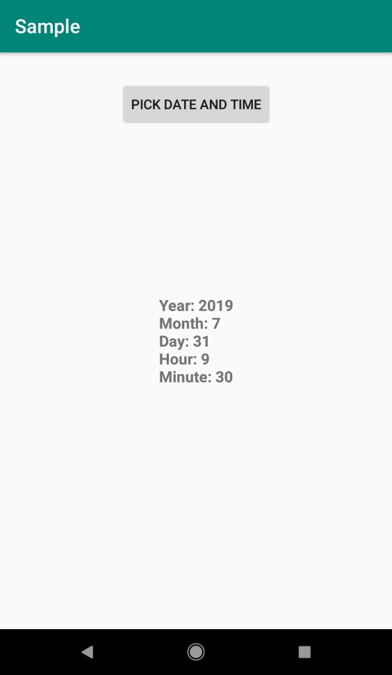 <?xml version="1.0" encoding="utf-8"?> <RelativeLayout xmlns:android="http://schemas.android.com/apk/res/android" xmlns:tools="http://schemas.android.com/tools" android:layout_width="match_parent" android:layout_height="match_parent" tools:context=".MainActivity"> <Button android:id="@+id/btnPick" android:layout_width="wrap_content" android:layout_height="wrap_content" android:layout_centerHorizontal="true" android:layout_marginTop="30dp" android:text="Pick Date and TIme"/> <TextView android:id="@+id/textView" android:layout_width="wrap_content" android:layout_height="wrap_content" android:layout_centerInParent="true" android:textSize="16sp" android:textStyle="bold"/> </RelativeLayout>