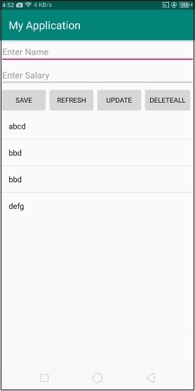 在上面的程式碼中,我們使用了姓名和工資作為 EditText,當用戶點選儲存按鈕時,它會將資料儲存到 sqlite 資料庫中。插入值後點擊重新整理按鈕以從遊標中更新 ListView 無需重複。如果使用者點選更新按鈕,它將更新資料。
