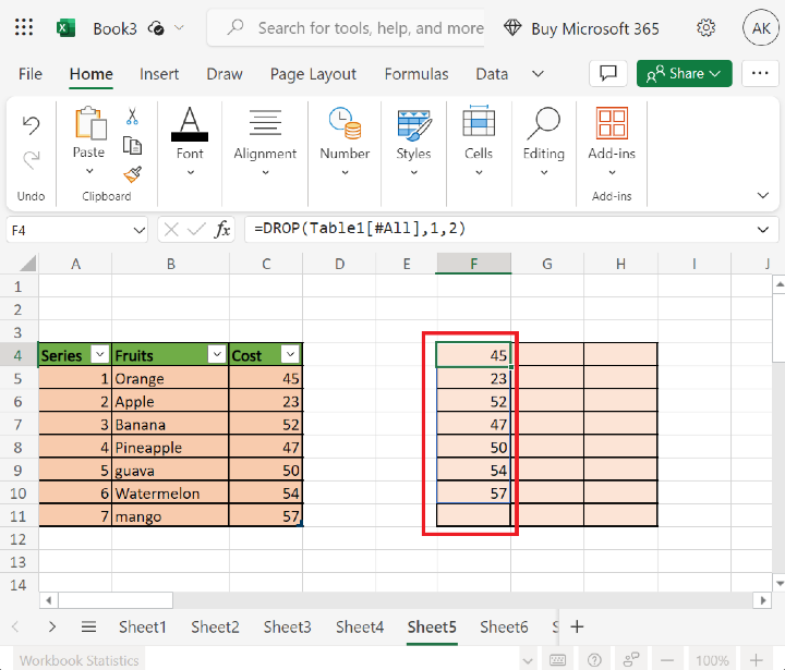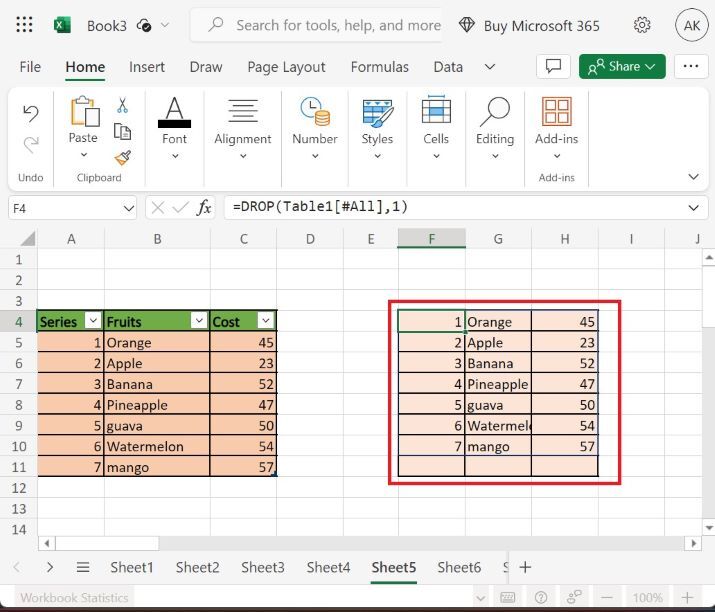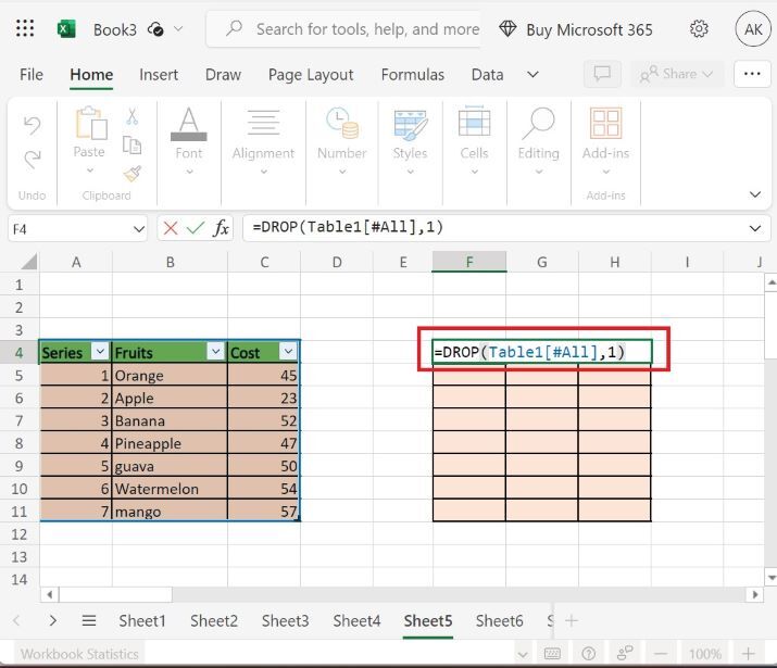 使用者可以使用簡單的示例來演示如何在 Excel 365 版本中使用 drop 函式來刪除或刪除使用者所需的行列數。使用者可以使用該語法或函式來處理行和列,這將顯示結果。