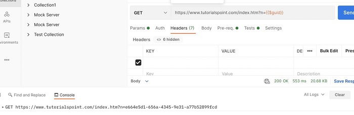 因此,{{$guid}} 可以直接在 Postman 中使用,而無需對變數進行任何預先處理。Postman 支援動態變數。GUID 就是這樣一個例項。