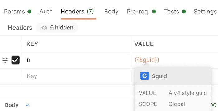 動態 GUID 也可以直接新增到請求標頭中,格式為 {{$guid}}。