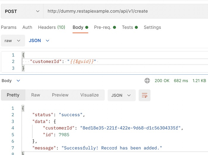}傳送 POST 請求。獲得響應後,響應正文顯示 customerID 欄位具有使用 GUID 生成的動態值。