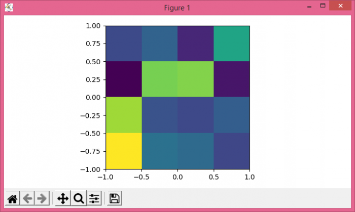import numpy as np from matplotlib import pyplot as plt plt.rcParams["figure.figsize"] = [7.00, 3.50] plt.rcParams["figure.autolayout"] = True data = np.random.rand(4, 4) plt.imshow(data, extent=[-1, 1, -1, 1]) plt.show()