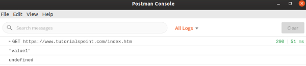 步驟 5 − 在收到響應後,開啟 Postman 控制檯。它首先顯示 value1,這是為全域性變數 g 設定的值。接下來,它顯示 undefined,因為全域性變數 g 的值已在步驟 3 中刪除。