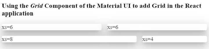 import React from "react"; import Box from "@mui/material/Box"; import Paper from "@mui/material/Paper"; import Grid from "@mui/material/Grid"; const App = () => { return ( <div> <h3> {" "} Using the <i> Grid </i> Component of the Material UI to add Grid in the React application {" "} </h3> <Box sx = {{ flexGrow: 1 }}> <Grid container spacing = {2}> <Grid item xs = {6}> <Paper elevation = {16}> xs=6 </Paper> </Grid> <Grid item xs = {6}> <Paper elevation = {16}> xs=6 </Paper> </Grid> <Grid item xs = {8}> <Paper elevation = {16}> xs=8 </Paper> </Grid> <Grid item xs = {4}> <Paper elevation = {16}> xs=4 </Paper> </Grid> </Grid> </Box> </div> ); }; export default App;