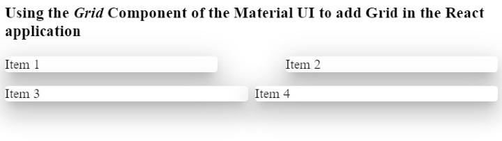 import React from "react"; import Paper from "@mui/material/Paper"; import Grid from "@mui/material/Grid"; const App = () => { return ( <div> <h3> {" "} Using the <i> Grid </i> Component of the Material UI to add Grid in the React application {" "} </h3> <div> <Grid container spacing = {10}> <Grid item xs = {6}> <Paper elevation = {16}> Item 1 </Paper> </Grid> <Grid item xs = {6}> <Paper elevation = {16}> Item 2 </Paper> </Grid> </Grid> </div> <div style = {{ width: "100%", marginTop: "1rem" }}> <Grid container spacing = {1}> <Grid item xs = {6}> <Paper elevation = {16}> Item 3 </Paper> </Grid> <Grid item xs = {6}> <Paper elevation = {16}> Item 4 </Paper> </Grid> </Grid> </div> </div> ); }; export default App;