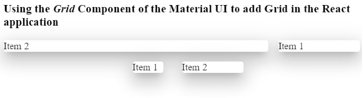 import React from "react"; import Paper from "@mui/material/Paper"; import Grid from "@mui/material/Grid"; const App = () => { return ( <div> <h3> {" "} Using the <i> Grid </i> Component of the Material UI to add Grid in the React application {" "} </h3> <div> <Grid container spacing = {2} direction = "row-reverse"> <Grid item xs = {3}> <Paper elevation = {16}> Item 1 </Paper> </Grid> <Grid item xs = {9}> <Paper elevation = {16}> Item 2 </Paper> </Grid> </Grid> </div> <div style = {{ width: "50%", marginTop: "1rem", height: 300 }}> <Grid container spacing = {10} justifyContent = "flex-end"> <Grid item xs = {2}> <Paper elevation = {16} style = {{ width: 50 }}> Item 1 </Paper> </Grid> <Grid item xs = {2}> <Paper elevation = {16} style = {{ width: 100 }}> Item 2 </Paper> </Grid> </Grid> </div> </div> ); }; export default App;