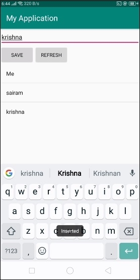 <?xml version="1.0" encoding="utf-8"?> <LinearLayout xmlns:android="http://schemas.android.com/apk/res/android" xmlns:tools="http://schemas.android.com/tools" android:layout_width="match_parent" android:layout_height="match_parent" tools:context=".MainActivity" android:orientation="vertical"> <EditText android:id="@+id/name" android:layout_width="match_parent" android:hint="Enter Name" android:layout_height="wrap_content" /> <LinearLayout android:layout_width="wrap_content" android:layout_height="wrap_content"> <Button android:id="@+id/save" android:text="Save" android:layout_width="wrap_content" android:layout_height="wrap_content" /> <Button android:id="@+id/refresh" android:text="Refresh" android:layout_width="wrap_content" android:layout_height="wrap_content" /> </LinearLayout> <ListView android:id="@+id/listView" android:layout_width="match_parent" android:layout_height="wrap_content"> </ListView> </LinearLayout>