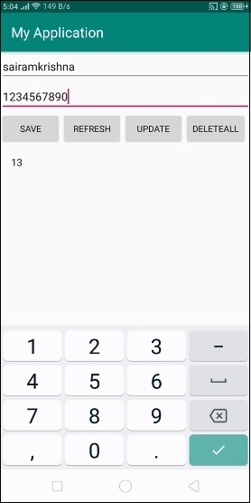 <?xml version="1.0" encoding="utf-8"?> <LinearLayout xmlns:android="http://schemas.android.com/apk/res/android" xmlns:tools="http://schemas.android.com/tools" android:layout_width="match_parent" android:layout_height="match_parent" tools:context=".MainActivity" android:orientation="vertical"> <EditText android:id="@+id/name" android:layout_width="match_parent" android:hint="Enter Name" android:layout_height="wrap_content" /> <EditText android:id="@+id/salary" android:layout_width="match_parent" android:inputType="numberDecimal" android:hint="Enter Salary" android:layout_height="wrap_content" /> <LinearLayout android:layout_width="wrap_content" android:layout_height="wrap_content"><Button android:id="@+id/save" android:text="Save" android:layout_width="wrap_content" android:layout_height="wrap_content" /> <Button android:id="@+id/refresh" android:text="Refresh" android:layout_width="wrap_content" android:layout_height="wrap_content" /> <Button android:id="@+id/udate" android:text="Update" android:layout_width="wrap_content" android:layout_height="wrap_content" /> <Button android:id="@+id/Delete" android:text="DeleteALL" android:layout_width="wrap_content" android:layout_height="wrap_content" /> </LinearLayout> <ListView android:id="@+id/listView" android:layout_width="match_parent" android:layout_height="wrap_content"> </ListView> </LinearLayout>