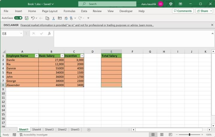 使用者必須拖動位於 E2 單元格右下角的“+”號,並將其拖放到 E8 單元格,以計算其餘員工的總工資。
