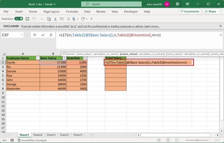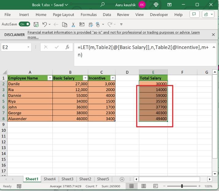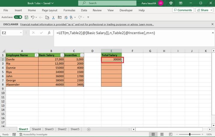 在 E2 單元格中輸入公式“=LET(m,Table2[@[Basic Salary]],n,Table2[@Incentive],m+n)” ,如下圖所示: