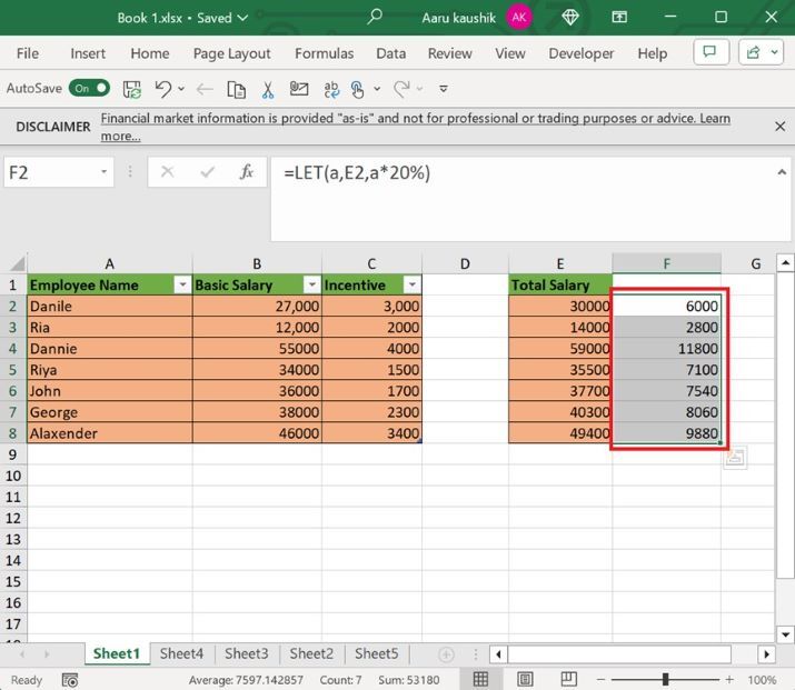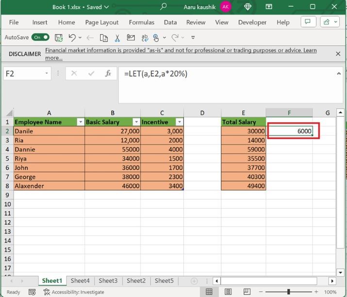 假設我們希望計算員工總工資的 20%。為此,在 F2 單元格中輸入公式“=LET(a,E2,a*20%)”,然後按“Enter”鍵,如下所示: