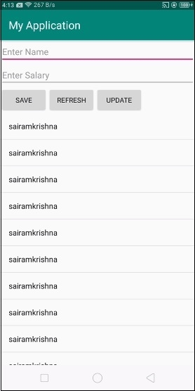 在上面的程式碼中,我們使用了姓名和薪水作為EditText,當用戶點選儲存按鈕時,它會將資料儲存到SQLite資料庫中。插入值後,點選重新整理按鈕以使用遊標LIKE子句更新ListView。如果使用者點選更新按鈕,它將使用薪水更新資料。