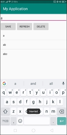 <?xml version="1.0" encoding="utf-8"?> <LinearLayout xmlns:android="http://schemas.android.com/apk/res/android" xmlns:tools="http://schemas.android.com/tools" android:layout_width="match_parent" android:layout_height="match_parent" tools:context=".MainActivity" android:orientation="vertical"> <EditText android:id="@+id/name" android:layout_width="match_parent" android:hint="Enter Name" android:layout_height="wrap_content" /> <LinearLayout android:layout_width="wrap_content" android:layout_height="wrap_content"> <Button android:id="@+id/save" android:text="Save" android:layout_width="wrap_content" android:layout_height="wrap_content" /> <Button android:id="@+id/refresh" android:text="Refresh" android:layout_width="wrap_content" android:layout_height="wrap_content" /> </LinearLayout> <ListView android:id="@+id/listView" android:layout_width="match_parent" android:layout_height="wrap_content"> </ListView> </LinearLayout>