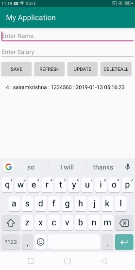 <?xml version = "1.0" encoding = "utf-8"?> <LinearLayout xmlns:android = "http://schemas.android.com/apk/res/android" xmlns:tools = "http://schemas.android.com/tools" android:layout_width = "match_parent" android:layout_height = "match_parent" tools:context = ".MainActivity" android:orientation = "vertical"> <EditText android:id = "@+id/name" android:layout_width = "match_parent" android:hint = "Enter Name" android:layout_height = "wrap_content" /> <EditText android:id = "@+id/salary" android:layout_width = "match_parent" android:inputType = "numberDecimal" android:hint = "Enter Salary" android:layout_height = "wrap_content" /> <LinearLayout android:layout_width = "wrap_content" android:layout_height = "wrap_content"><Button android:id = "@+id/save" android:text = "Save" android:layout_width = "wrap_content" android:layout_height = "wrap_content" /> <Button android:id = "@+id/refresh" android:text = "Refresh" android:layout_width = "wrap_content" android:layout_height = "wrap_content" /> <Button android:id = "@+id/udate" android:text = "Update" android:layout_width = "wrap_content" android:layout_height = "wrap_content" /> <Button android:id = "@+id/Delete" android:text = "DeleteALL" android:layout_width = "wrap_content" android:layout_height = "wrap_content" /> </LinearLayout> <ListView android:id = "@+id/listView" android:layout_width = "match_parent" android:layout_height = "wrap_content"> </ListView> </LinearLayout>