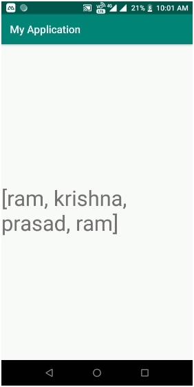 package com.example.myapplication; import android.os.Build; import android.os.Bundle; import android.support.annotation.RequiresApi; import android.support.v7.app.AppCompatActivity; import android.view.View; import android.widget.TextView; import java.util.concurrent.LinkedBlockingDeque; public class MainActivity extends AppCompatActivity { LinkedBlockingDeque linkedBlockingDeque; @RequiresApi(api = Build.VERSION_CODES.LOLLIPOP) @Override protected void onCreate(Bundle savedInstanceState) { super.onCreate(savedInstanceState); setContentView(R.layout.activity_main); linkedBlockingDeque = new LinkedBlockingDeque(); final TextView actionEvent = findViewById(R.id.actionEvent); linkedBlockingDeque.add("sai"); linkedBlockingDeque.add("ram"); linkedBlockingDeque.add("krishna"); linkedBlockingDeque.add("prasad"); linkedBlockingDeque.add("ram"); actionEvent.setText("" + linkedBlockingDeque); actionEvent.setOnClickListener(new View.OnClickListener() { @Override public void onClick(View v) { linkedBlockingDeque.poll(); actionEvent.setText(""+linkedBlockingDeque); } }); } }