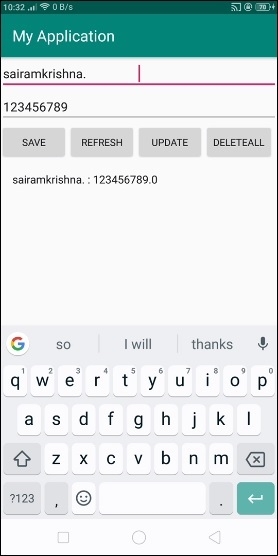 在上面的程式碼中,我們使用了姓名和薪資作為EditText,當用戶點選儲存按鈕時,它會將資料儲存到SQLite資料庫中。點選重新整理按鈕以獲取ListView的更改。