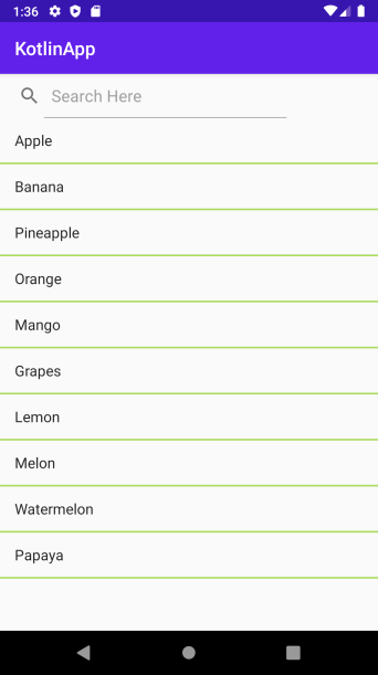 <?xml version="1.0" encoding="utf-8"?> <RelativeLayout xmlns:android="http://schemas.android.com/apk/res/android" xmlns:tools="http://schemas.android.com/tools" android:layout_width="match_parent" android:layout_height="match_parent" tools:context=".MainActivity"> <ListView android:id="@+id/listView" android:layout_width="match_parent" android:layout_height="match_parent" android:layout_below="@+id/searchView" android:divider="#ad5" android:dividerHeight="2dp" /> <SearchView android:id="@+id/searchView" android:layout_width="wrap_content" android:layout_height="wrap_content" android:layout_alignParentTop="true" android:iconifiedByDefault="false" android:queryHint="Search Here" /> </RelativeLayout>