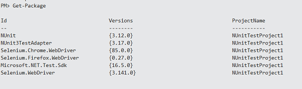 我們必須執行安裝Selenium webdriver和NUnit所需的**程式包管理器**命令。