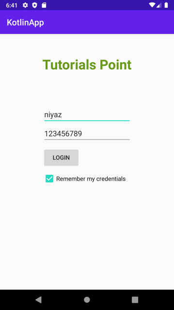 <?xml version="1.0" encoding="utf-8"?> <RelativeLayout xmlns:android="http://schemas.android.com/apk/res/android" xmlns:tools="http://schemas.android.com/tools" android:layout_width="match_parent" android:layout_height="match_parent" tools:context=".MainActivity"> <TextView android:id="@+id/textView" android:layout_width="wrap_content" android:layout_height="wrap_content" android:layout_centerHorizontal="true" android:layout_marginTop="50dp" android:text="Tutorials Point" android:textAlignment="center" android:textColor="@android:color/holo_green_dark" android:textSize="32sp" android:textStyle="bold" /> <EditText android:id="@+id/etName" android:layout_width="wrap_content" android:layout_height="wrap_content" android:layout_below="@+id/textView" android:layout_centerInParent="true" android:layout_marginTop="75dp" android:ems="10" android:hint="Enter Name" /> <EditText android:id="@+id/etPassword" android:layout_width="wrap_content" android:layout_height="wrap_content" android:layout_below="@id/etName" android:layout_centerHorizontal="true" android:ems="10" android:hint="Enter Password" /> <Button android:id="@+id/btnLogin" android:layout_width="wrap_content" android:layout_height="wrap_content" android:layout_below="@id/etPassword" android:layout_alignStart="@id/etPassword" android:layout_marginTop="10dp" android:text="Login" /> <CheckBox android:id="@+id/checkBox" android:layout_width="wrap_content" android:layout_height="wrap_content" android:layout_below="@id/btnLogin" android:layout_alignStart="@id/btnLogin" android:layout_marginTop="10dp" android:text="Remember my credentials" /> </RelativeLayout>