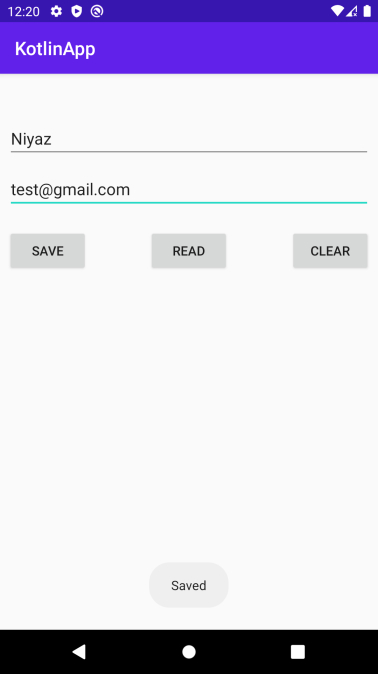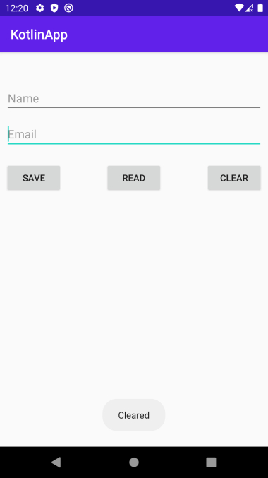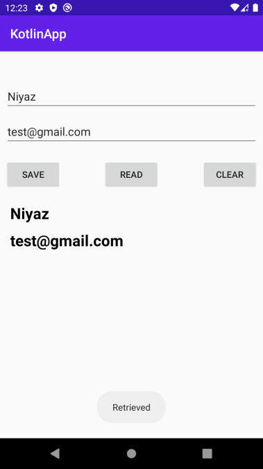 <?xml version="1.0" encoding="utf-8"?> <RelativeLayout xmlns:android="http://schemas.android.com/apk/res/android" xmlns:tools="http://schemas.android.com/tools" android:layout_width="match_parent" android:layout_height="match_parent" android:padding="8dp" tools:context=".MainActivity"> <Button android:id="@+id/btnSave" android:layout_width="wrap_content" android:layout_height="wrap_content" android:layout_below="@+id/etEmail" android:layout_alignParentStart="true" android:layout_marginTop="20dp" android:onClick="saveData" android:text="Save" /> <Button android:id="@+id/btnRetrieve" android:layout_width="wrap_content" android:layout_height="wrap_content" android:layout_below="@+id/etEmail" android:layout_centerInParent="true" android:layout_marginTop="20dp" android:onClick="readData" android:text="Read" /> <Button android:id="@+id/btnClear" android:layout_width="wrap_content" android:layout_height="wrap_content" android:layout_below="@+id/etEmail" android:layout_alignParentEnd="true" android:layout_marginTop="20dp" android:onClick="clearData" android:text="Clear" /> <EditText android:id="@+id/etEmail" android:layout_width="match_parent" android:layout_height="wrap_content" android:layout_below="@+id/etName" android:layout_marginTop="10dp" android:ems="10" android:hint="Email" android:inputType="textEmailAddress" /> <EditText android:id="@+id/etName" android:layout_width="match_parent" android:layout_height="wrap_content" android:layout_alignStart="@+id/etEmail" android:layout_marginTop="40dp" android:ems="10" android:hint="Name" android:inputType="text" /> <TextView android:id="@+id/textViewName" android:layout_width="match_parent" android:layout_height="wrap_content" android:layout_below="@+id/btnClear" android:layout_marginTop="20dp" android:paddingStart="8dp" android:textColor="@android:color/background_dark" android:textSize="24sp" android:textStyle="bold" /> <TextView android:id="@+id/textViewEmail" android:layout_width="match_parent" android:layout_height="wrap_content" android:layout_below="@+id/textViewName" android:layout_marginTop="10dp" android:paddingStart="8dp" android:textColor="@android:color/background_dark" android:textSize="24sp" android:textStyle="bold" /> </RelativeLayout>
