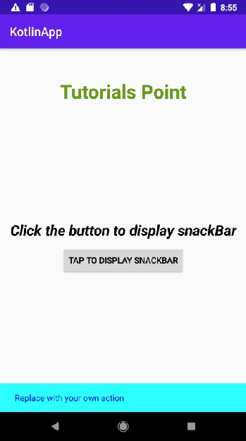 <?xml version="1.0" encoding="utf-8"?> <RelativeLayout xmlns:android="http://schemas.android.com/apk/res/android" xmlns:tools="http://schemas.android.com/tools" android:layout_width="match_parent" android:layout_height="match_parent" tools:context=".MainActivity"> <TextView android:layout_width="wrap_content" android:layout_height="wrap_content" android:layout_centerHorizontal="true" android:layout_marginTop="50dp" android:text="Tutorials Point" android:textAlignment="center" android:textColor="@android:color/holo_green_dark" android:textSize="32sp" android:textStyle="bold" /> <TextView android:id="@+id/textView" android:layout_width="wrap_content" android:layout_height="wrap_content" android:layout_centerInParent="true" android:text="Click the button to display snackBar" android:textColor="@android:color/background_dark" android:textSize="24sp" android:textStyle="bold|italic" /> <Button android:id="@+id/btnSnackBar" android:layout_width="wrap_content" android:layout_height="wrap_content" android:layout_below="@id/textView" android:layout_centerInParent="true" android:layout_marginTop="10dp" android:text="Tap To Display SnackBar" android:textColor="@android:color/background_dark" /> </RelativeLayout>