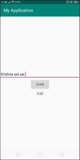 <?xml version="1.0" encoding="utf-8"?> <LinearLayout xmlns:android="http://schemas.android.com/apk/res/android" xmlns:app="http://schemas.android.com/apk/res-auto" xmlns:tools="http://schemas.android.com/tools" android:layout_width="match_parent" android:layout_height="match_parent" android:orientation="vertical" android:gravity="center" tools:context=".MainActivity"> <EditText android:id="@+id/name" android:layout_width="match_parent" android:hint="Enter name" android:layout_height="wrap_content" /> <Button android:id="@+id/click" android:text="Click" android:layout_width="wrap_content" android:layout_height="wrap_content" /> <TextView android:id="@+id/textview" android:layout_width="wrap_content" android:textSize="25sp" android:layout_height="wrap_content" /> </LinearLayout>