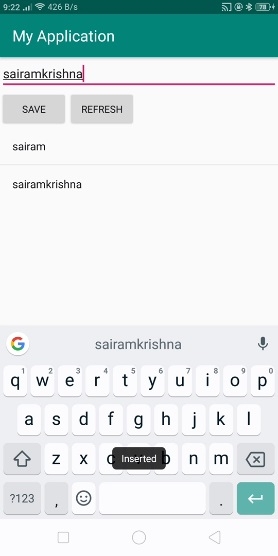 <?xml version = "1.0" encoding = "utf-8"?> <LinearLayout xmlns:android = "http://schemas.android.com/apk/res/android" xmlns:tools = "http://schemas.android.com/tools" android:layout_width = "match_parent" android:layout_height = "match_parent" tools:context = ".MainActivity" android:orientation = "vertical"> <EditText android:id = "@+id/name" android:layout_width = "match_parent" android:hint = "Enter Name" android:layout_height = "wrap_content" /> <LinearLayout android:layout_width = "wrap_content" android:layout_height = "wrap_content"> <Button android:id = "@+id/save" android:text = "Save" android:layout_width = "wrap_content" android:layout_height = "wrap_content" /> <Button android:id = "@+id/refresh" android:text = "Refresh" android:layout_width = "wrap_content" android:layout_height = "wrap_content" /> </LinearLayout> <ListView android:id = "@+id/listView" android:layout_width = "match_parent" android:layout_height = "wrap_content"> </ListView> </LinearLayout>