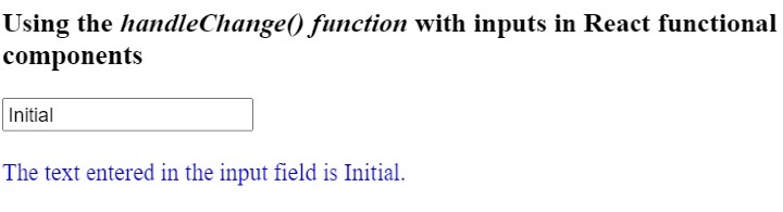 import React from "react"; import { useState } from "react"; function App() { const [value, setValue] = useState("Initial"); function handleChange(event) { // gives the value of the targetted element let value = event.target.value; setValue(value); } return ( <div> <h3> Using the <i> handleChange() function </i> with inputs in React functional components. </h3> <input type = "text" onChange = {handleChange} value = {value} /> <br/> <br/> <div style = {{ color: "blue" }}> {" "} The text entered in the input field is {value}.{" "} </div> </div> ); } export default App;