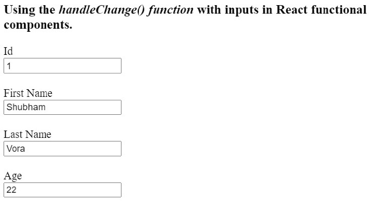 import React from "react"; import { useState } from "react"; function App() { const [id, setId] = useState("1"); const [firstName, setFirstName] = useState("Shubham"); const [lastName, setLastName] = useState("Vora"); const [age, setAge] = useState(22); function handleChange(event) { // gives the value of the targetted element let value = event.target.value; let inputName = event.target.name; if (inputName == "id") { setId(value); } else if (inputName == "fname") { setFirstName(value); } else if (inputName == "lname") { setLastName(value); } else { setAge(age); } } return ( <div> <h3> Using the <i> handleChange() function </i> with inputs in React functional components. </h3> <label for = "Id"> Id </label> <br /> <input type = "text" id = "Id" name = "id" onChange = {handleChange} value = {id} /> <br /> <br /> <label for = "fname"> First Name </label> <br /> <input type = "text" id = "fname" name = "fname" onChange = {handleChange} value = {firstName} /> <br /> <br /> <label for = "lname"> Last Name </label> <br /> <input type = "text" id = "lname" name = "lname" onChange = {handleChange} value = {lastName} /> <br /> <br /> <label for = "age"> Age </label> <br /> <input type = "text" id = "age" name = "age" onChange = {handleChange} value = {age} /> <br /> <br /> </div> ); } export default App;
