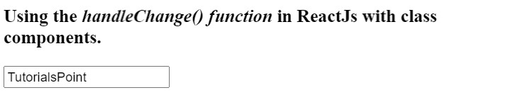 import React from "react"; class App extends React.Component { constructor(props) { super(props); this.state = { text: "Sample", }; this.handleChange = this.handleChange.bind(this); } handleChange(event) { this.state.text = event.target.value; } render() { return ( <div> <h2> {" "} Using the <i> handleChange() function </i> in ReactJs with class components.{" "} </h2> <input onChange = {this.handleChange} name = "text" /> </div> ); } } export default App;