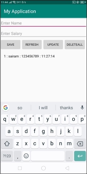 在上面的程式碼中,我們使用了姓名和工資作為 EditText,當用戶點選儲存按鈕時,它會將資料儲存到 sqlite 資料庫中。點選重新整理按鈕以獲取列表檢視的更改。