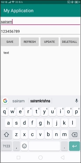 在上面的程式碼中,我們使用了名稱和薪水作為編輯文字,當用戶點選儲存按鈕時,它會將資料儲存到SQLite資料庫中。點選重新整理按鈕以獲取listview的更改。
