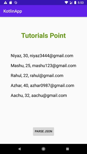 <?xml version="1.0" encoding="utf-8"?> <RelativeLayout xmlns:android="http://schemas.android.com/apk/res/android" xmlns:tools="http://schemas.android.com/tools" android:layout_width="match_parent" android:layout_height="match_parent" android:padding="16sp" tools:context=".MainActivity"> <TextView android:layout_width="wrap_content" android:layout_height="wrap_content" android:layout_centerHorizontal="true" android:layout_marginTop="50dp" android:text="Tutorials Point" android:textAlignment="center" android:textColor="@android:color/holo_green_dark" android:textSize="32sp" android:textStyle="bold" /> <TextView android:id="@+id/textViewResult" android:layout_width="wrap_content" android:layout_height="wrap_content" android:layout_centerInParent="true" android:textColor="@android:color/black" android:textSize="20sp" /> <Button android:id="@+id/btnParse" android:layout_width="wrap_content" android:layout_height="wrap_content" android:layout_alignParentBottom="true" android:layout_centerInParent="true" android:layout_marginBottom="20sp" android:text="Parse JSON" /> </RelativeLayout>