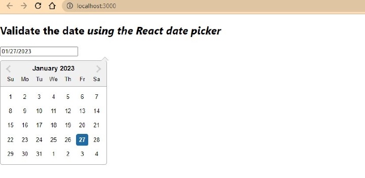 import React, { useState } from "react"; import validator from "validator"; const App = () => { const [dateString, setDateString] = useState("2023/01/27"); const [message, setMessage] = useState(" "); const [messageColor, setMessageColor] = useState("green"); function handleDate(event) { let inputDate = event.target.value; setDateString(inputDate); if (validator.isDate(inputDate)) { setMessage("Date is Valid"); setMessageColor("green"); } else { setMessage("Please, Enter a valid date!"); setMessageColor("red"); } } return ( <div> <h2> {" "} Validate the date <i> using the validator NPM package </i> </h2> <div style = {{ color: messageColor }}> {message} </div> <input type = "text" value = {dateString} onChange = {handleDate} /> <div> You have entered the {dateString} in the input. </div> </div> ); }; export default App;