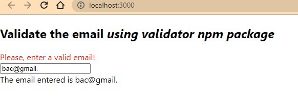 import React, { useState } from "react"; import validator from "validator"; const App = () => { const [email, setEmail] = useState("bac@gmail.com"); const [message, setMessage] = useState(" "); function handleEmail(event) { let new_Email = event.target.value; setEmail(new_Email); if (!validator.isEmail(new_Email)) { setMessage("Please, enter a valid email!"); } else { setMessage(""); } } return ( <div> <h2> {" "} Validate the email <i> using validator npm package </i> </h2> <div style = {{ color: "red" }}> {message} </div> <input type = "email" value = {email} onChange = {handleEmail} /> <div> The email entered is {email} </div> </div> ); }; export default App;