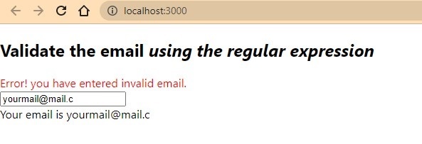 import React, { useState } from "react"; const App = () => { const [email, setEmail] = useState("yourmail@mail.com"); const [message, setMessage] = useState(" "); function handleEmail(event) { let inputValue = event.target.value; setEmail(inputValue); let emailRegex = /[a-z0-9]+@[a-z]+\.[a-z]{2,3}/; if (!emailRegex.test(inputValue)) { setMessage("Error! you have entered invalid email."); } else { setMessage(""); } } return ( <div> <h2> {" "} Validate the email <i> using the regular expression </i> </h2> <div style = {{ color: "red" }}> {message} </div> <input type = "email" value = {email} onChange = {handleEmail} /> <div> Your email is {email} </div> </div> ); }; export default App;