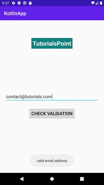 <?xml version="1.0" encoding="utf-8"?> <RelativeLayout xmlns:android="http://schemas.android.com/apk/res/android" android:id="@+id/relativeLayout" android:layout_width="match_parent" android:layout_height="match_parent"> <TextView android:id="@+id/textView" android:layout_width="wrap_content" android:layout_height="wrap_content" android:layout_centerHorizontal="true" android:layout_marginTop="70dp" android:background="#008080" android:padding="5dp" android:text="TutorialsPoint" android:textColor="#fff" android:textSize="24sp" android:textStyle="bold" /> <EditText android:id="@+id/editText" android:layout_width="match_parent" android:layout_height="wrap_content" android:layout_centerInParent="true" android:layout_margin="20dp" android:hint="Enter Email id" /> <Button android:id="@+id/text" android:layout_width="wrap_content" android:layout_height="wrap_content" android:layout_below="@+id/editText" android:layout_centerInParent="true" android:text="Check validation" android:textAlignment="center" android:textColor="#000" android:textSize="18sp" /> </RelativeLayout>