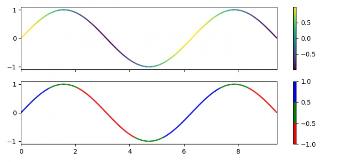 import numpy as np import matplotlib.pyplot as plt from matplotlib.collections import LineCollection from matplotlib.colors import ListedColormap, BoundaryNorm plt.rcParams["figure.figsize"] = [7.50, 3.50] plt.rcParams["figure.autolayout"] = True x = np.linspace(0, 3 * np.pi, 500) y = np.sin(x) dydx = np.cos(0.5 * (x[:-1] + x[1:])) points = np.array([x, y]).T.reshape(-1, 1, 2) segments = np.concatenate([points[:-1], points[1:]], axis=1) fig, axs = plt.subplots(2, 1, sharex=True, sharey=True) norm = plt.Normalize(dydx.min(), dydx.max()) lc = LineCollection(segments, cmap='viridis', norm=norm) lc.set_array(dydx) lc.set_linewidth(2) line = axs[0].add_collection(lc) fig.colorbar(line, ax=axs[0]) cmap = ListedColormap(['r', 'g', 'b']) norm = BoundaryNorm([-1, -0.5, 0.5, 1], cmap.N) lc = LineCollection(segments, cmap=cmap, norm=norm) lc.set_array(dydx) lc.set_linewidth(2) line = axs[1].add_collection(lc) fig.colorbar(line, ax=axs[1]) axs[0].set_xlim(x.min(), x.max()) axs[0].set_ylim(-1.1, 1.1) plt.show()